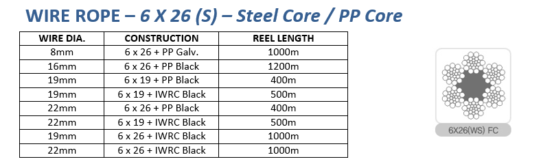 We manufacture Ungalvanised Steel Wire Rope in different sizes under following construction 6x7, 6x19, 6x26.6x31.6x36, 6x37, 6x41, 6x39 17x7 18x7, 34x7 4x39, 35x7 and these constructions are available in steel core and fibre core. The Ungalvanised Steel Wire Rope has application in engineering , shipping industries,construction work, mining, elevator, etc